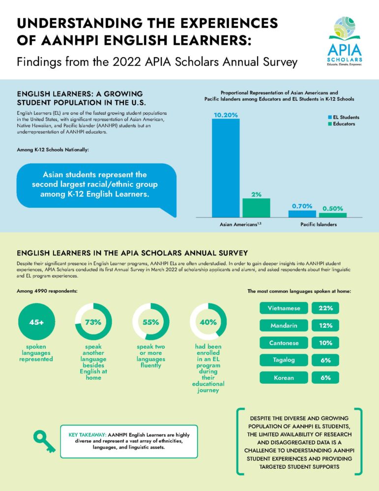 In partnership with UCLA’s Institute for Immigration, Globalization and Education, APIA Scholars will investigate how AANHPI students in California who are English Learners (ELs) have been included or excluded from EL services.